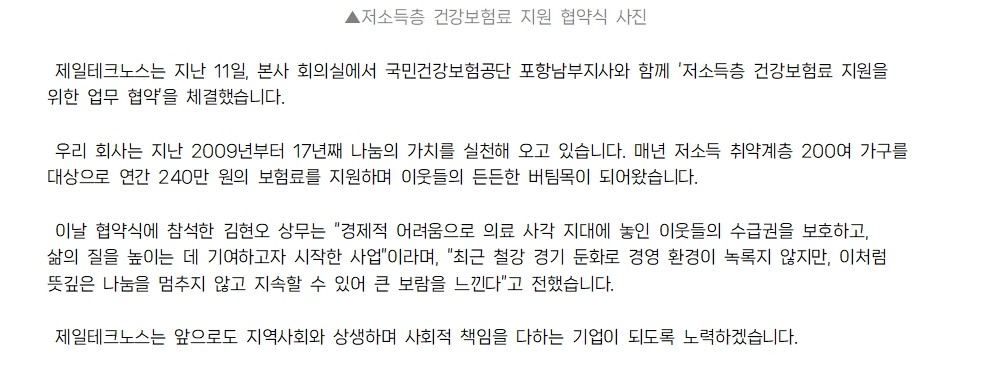 제일테크노스-국민건강보험공단, '저소득층 보험료 지원' 협약 체결